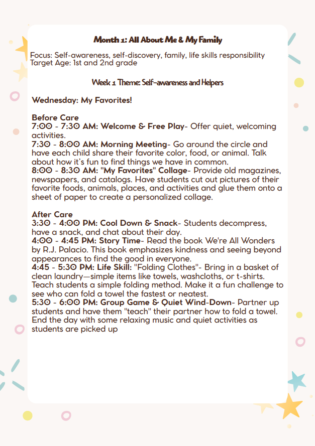 The DC Lesson Plan for 1st & 2nd Grade covers the theme All About Me & My Family. Activities build self-awareness, responsibility, and family connections while reinforcing literacy, math, and social-emotional learning. With daily before- and after-care guides, teachers and caregivers have a full month of structured fun.