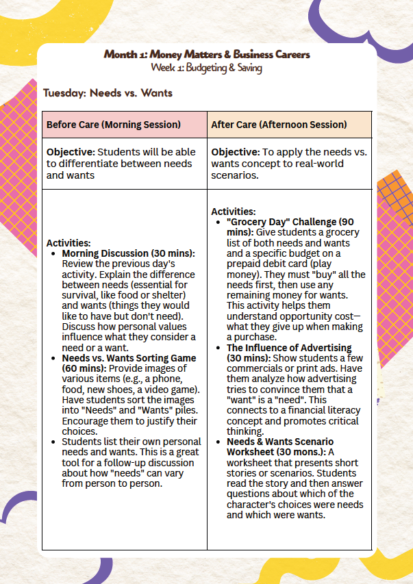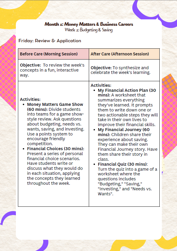 The DC Lesson Plan for 6th & 7th Grade focuses on Money Matters & Business Careers. Students learn budgeting, saving, investing, and entrepreneurship through hands-on simulations, games, and role-play. A full month of morning and after-care activities provides academic depth while building critical life skills.
