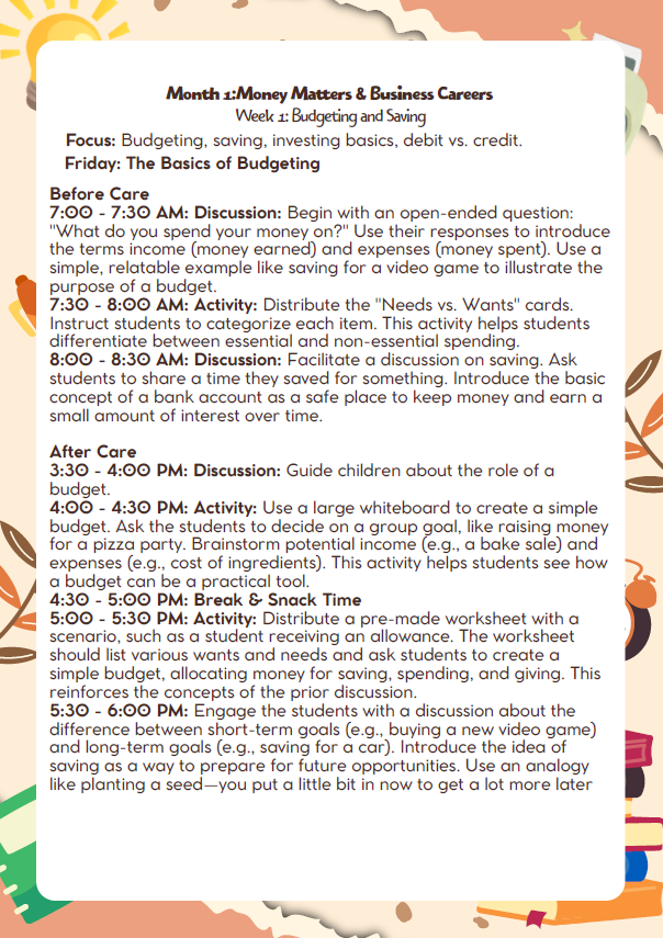 - Comprehensive Weekly Lessons – Cover budgeting, saving, business operations, teamwork, and pitching ideas.