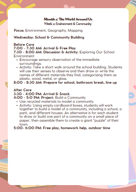 - 📖 Literacy – Journaling, reflective writing, and group reading activities.