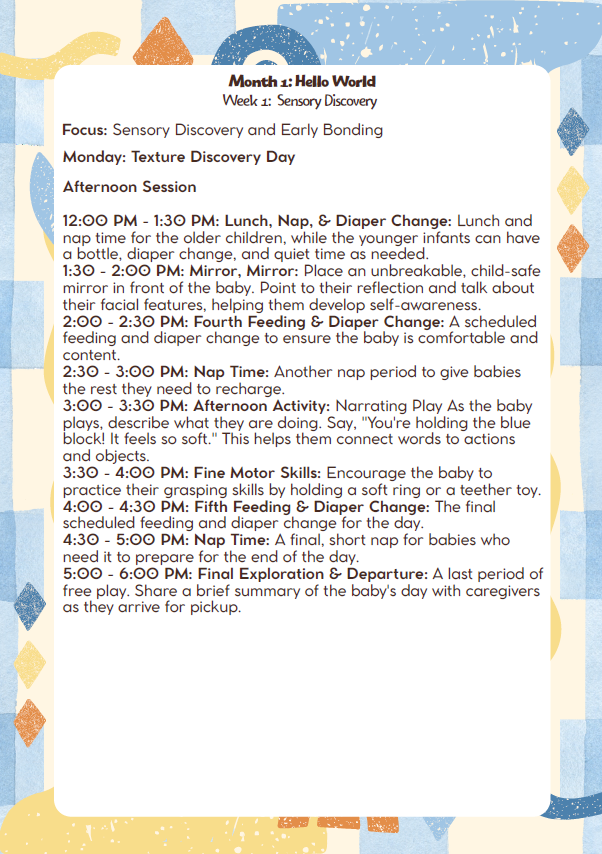 The Maryland September Lesson Plan for Infants is designed to support sensory, motor, and emotional growth through simple, engaging activities. With 20+ pages of songs, floor play, and caregiver-led games, babies begin building early awareness of themselves and their world.