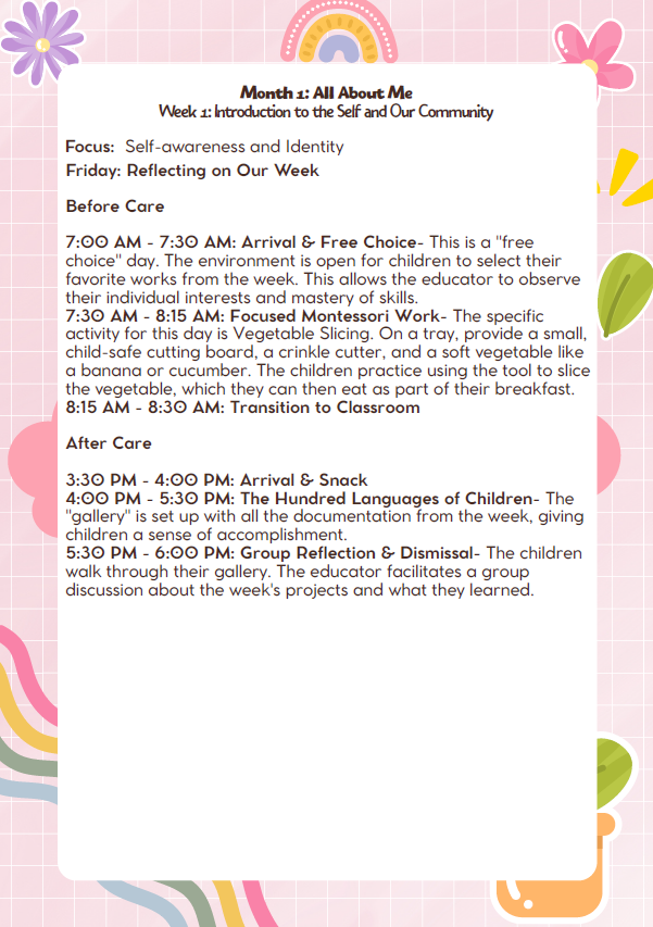 - π Week 1: All About Me β βMy Hands, My Work,β storytelling, and practical life skills like pouring and buttoning.