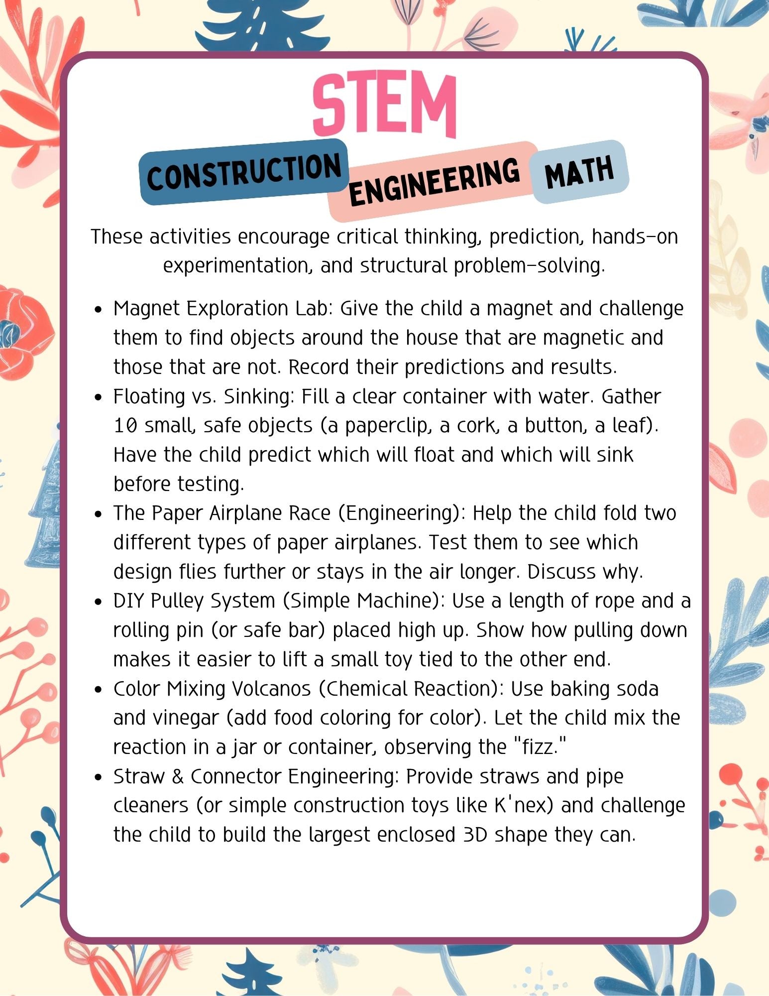 - The activity bank includes over 100 hands-on activities across key early childhood domains—STEM, Creative Arts, Fine and Gross Motor Skills, Language, Math, and Social-Emotional Learning—ensuring every child’s learning experience is fun, purposeful, and age-appropriate.