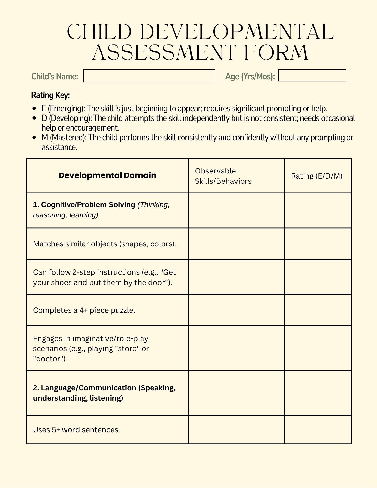 - Professional tracking tools such as a Child Developmental Assessment Form,