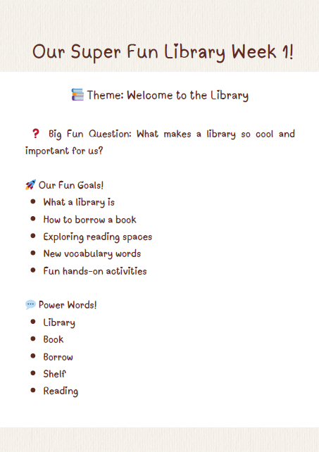The Magic of Libraries β Week 1 introduces children to what a library is, how to care for books, and why reading is special. Through playful stories, crafts, and hands-on activities, children begin building a love for literacy and learning.